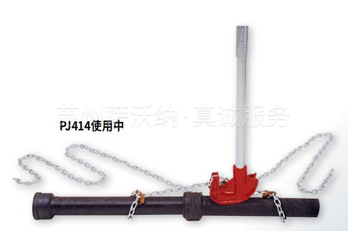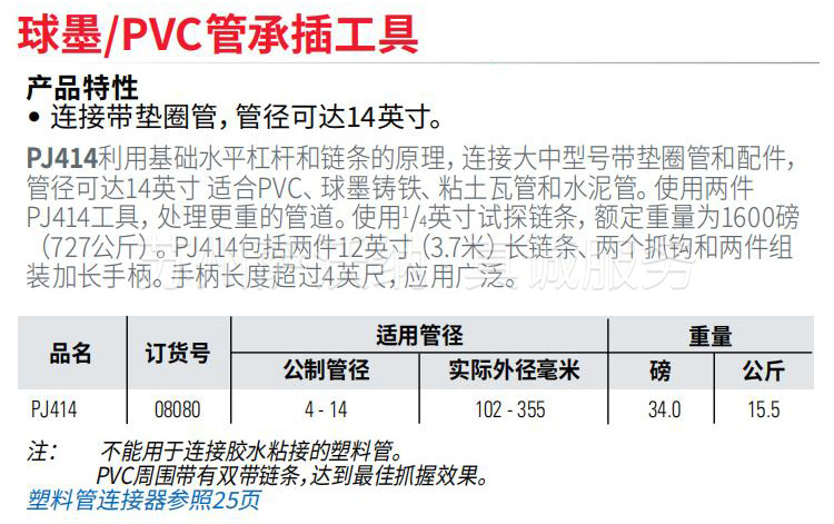 PJ414 多用途接管机采用基础的杆链设计,可连接 14" 以下的中型和大型密封管及管件。可用于 PVC 管、球墨铸铁管、陶瓷管、铸铁污水管和混凝土管。针对较重管道,可使用两台 PJ414。四分之一英寸校验线圈链的额定重量为 1600 磅(727 公斤)。PJ414 接管机配有两条 12'(3.7 米)长 的链条、两个抓钩、加上一个分体式可延伸手柄(长度可超过 4 英尺),适合各种应用场景。