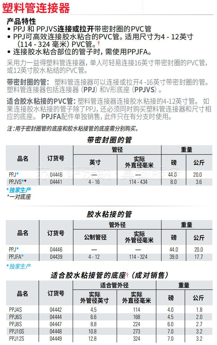 使用 PPJ PVC管承插器 和 PPJVS V型通用鞍座,可轻松连接或分离 4”-16” 英寸(114 – 434 毫米) 胶圈连接的 PVC 管。