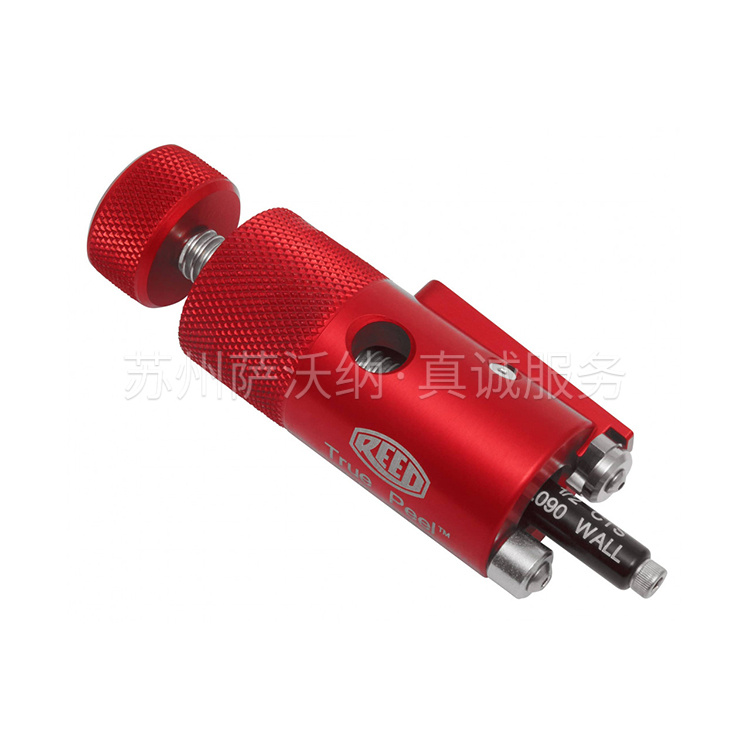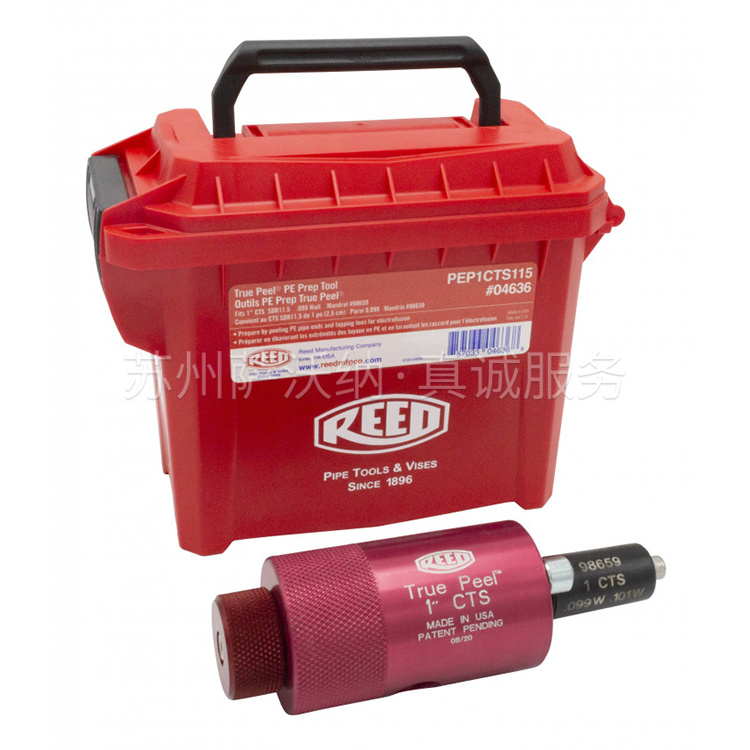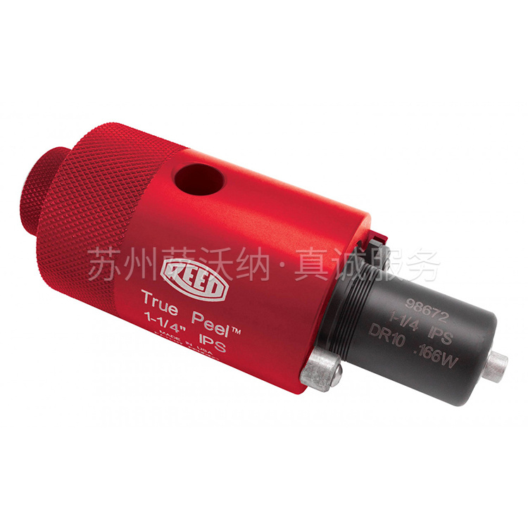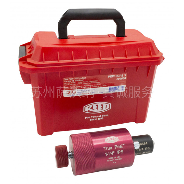 电熔要求管道的外径干净且无氧化层。True Peel® PE 制备工具可去除管道外径上的污垢和氧化层,为电熔做好准备。其弹簧加载式刀片不会跳动,并可在管道上保持一致的压力,从而产生光滑的完工表面。在可将椭圆管正圆化的紧邻配合芯轴的协助下,即使是面对非圆管,刀片也能够完整地剥离其外皮。观察窗使操作者能够通过观察处于窗口中部的管道端部来查看剥离何时完成。这些工具可以用于管道端部或分流 T 形管接头出口。每一种型号均具有特定尺寸以满足管道尺寸和管壁厚度。PE 管材去皮机刀片可以旋转 180° 以提供第二处切削刃,由此将使用寿命延长一倍。与具有大摆动半径的传统剥皮机不同,低断面 True Peel® 使其可以用于间隙有限的分流 T 形管接头出口。REED True Peel® 管材表面刮除工具采用保护性运输箱运输。
