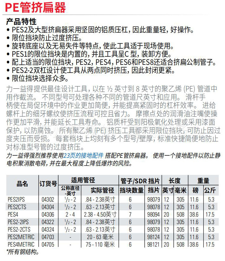 1、参见相关链接中 PE 挤压疏通工具掣子、CTS & IPS 或 Metric 掣子的规格。