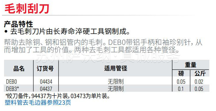 帮助去除铜、钢和铝管内的毛刺。DEB0带铝手柄和袖珍别针,从而增加了工具的价值。两种去毛刺工具都适用各种管径。