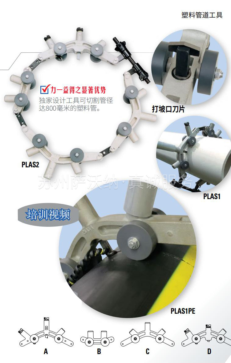 干净而安全!阀门和缝隙处不会有碎屑堵塞。仅需 6-8 英寸的工作空间,即可使用 PLAS 刀具环绕管材进行切割。螺母为弹簧加载,因此工具可切割椭圆管。PVC 切管机可同时进行切割和坡口加工。对于需要切割管道进行连接或在管道破裂后替换新管道的承包商来说是一个物美价廉的选择。降低整体的人工成本!