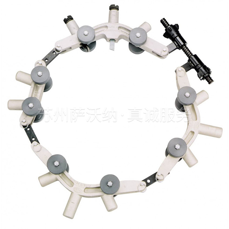 PLAS 旋转切管机非常适合切割沟槽内或地面上的 PVC 管 或 PE 管。每台 PLAS 旋转切管机只需要在管道周围留出 6”- 8” (153 - 203 mm) 的间隙,即可操作,从而降低了准备成本。外卡式切割轮可将切管机与管道对齐,以确保切割口平整笔直。每台 PLAS 切管机还可以用 PLAS4B* 坡口刀片打 15° 坡口。硬质合金刀片持久耐用,可穿透壁厚高达 2” 的 PVC 管。REED 开发了一种淬硬工具钢刀片,在切割 PE 管时可获得最佳的切割效果。改造后的刀尖可以在切割 PE 管的同时清理碎屑。只需更换刀片,PLAS 直列式旋转切管机便可实现 PVC 管切割和 PE 管切割之间的切换。