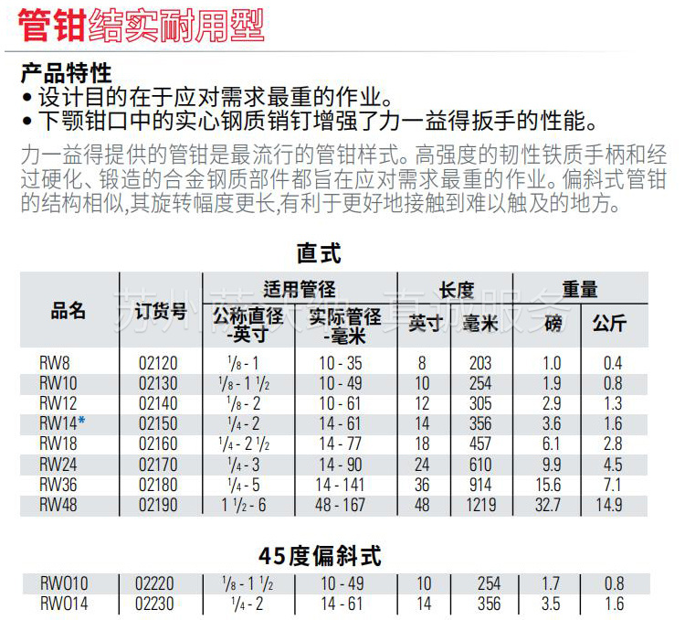 关于从18英寸到48英寸的直式扳手、45°偏斜式扳手和平板手,力得的管钳部件都可与美国大多数主要的重型品牌(包括RIDGID®)互相替换。可用部件包括上颚钳口、下颚钳口和销钉、圈状和平板弹簧,以及螺母。