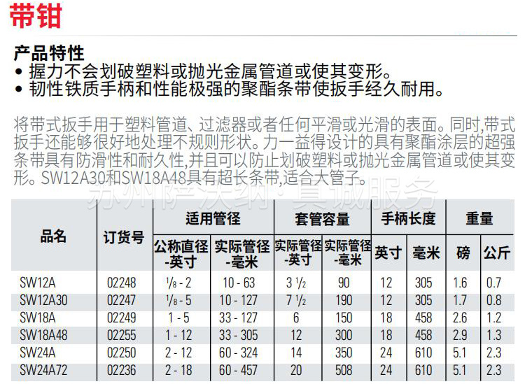将带式扳手用于塑料管道、过滤器或者任何平滑或光滑的表面。同时,带式扳手还能够很好地处理不规则形状。力得设计的具有聚酯涂层的超强条带具有防滑性和耐久性,并且可以防止划破塑料或抛光金属管道或使其变形。SW12A30和SW18A48具有超长条带,可对大直径管道发挥作用。
